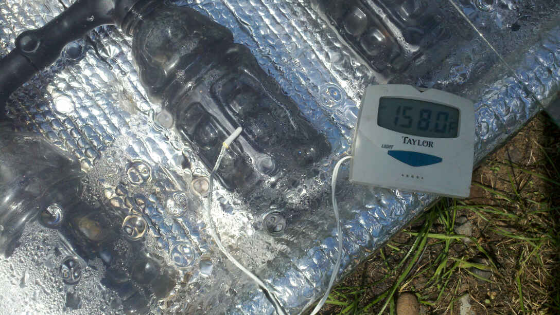 When assembled, water (from a swimming pool, for example) is cycled through the system through a pair of hoses. As water flows through the assembly, the temperature from the sun and air continuously heats the water. A pump may be used to help the water through the system.
